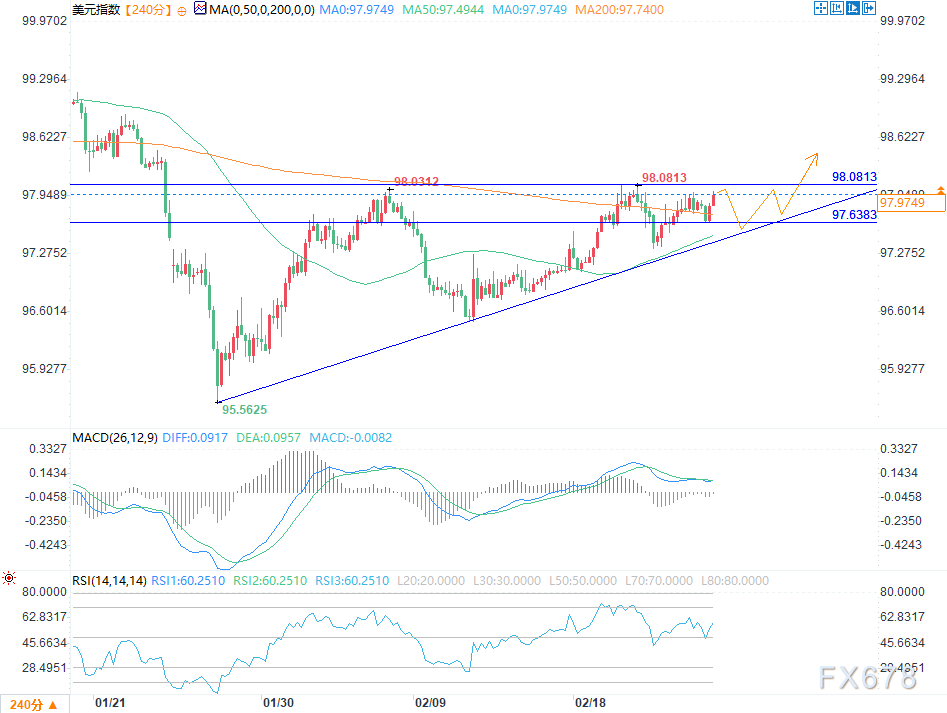 周三(2月25日)欧盘时段,美元指数(DXY)由亚盘时段的小幅走跌V形反弹至97.98附近,日内涨幅约0.10%。尽管美联储官员释放出偏鹰派信号,美元仍难以从近期整理区间中有效突破。
