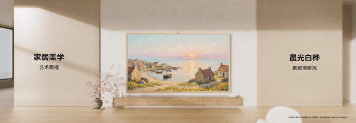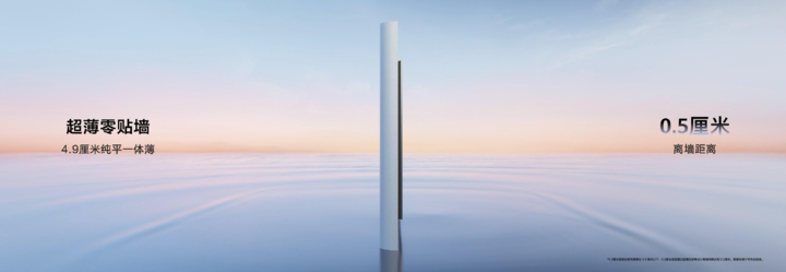 外观方面,该产品采用 4.9 厘米纯平一体超薄设计,背板与墙面之间的间隙约为 0.5 厘米。搭配艺术画框后,电视在关闭状态下可以呈现类似装饰画的效果,更容易融入家居环境。