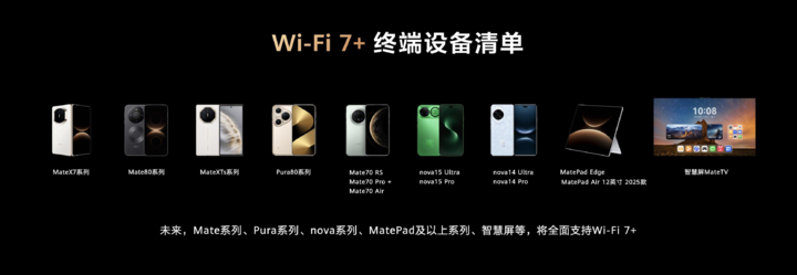 目前 Wi-Fi7+ 技术已经应用在多款华为旗舰终端,包括 Mate XTs 非凡大师、Pura80 系列以及 nova 15 Ultra 等机型。搭配 BE3 Pro 路由器或凌霄子母路由 Q7 使用时,可以激活完整技术能力。