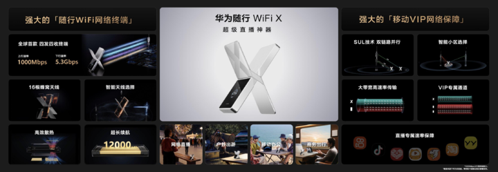 除了家庭设备,华为还发布了一款移动网络产品——随行 WiFi X。这款设备是全球首款支持四发四收天线设计的随行 WiFi 产品,四根天线可以同时进行信号收发,使设备峰值上行速率达到千兆级别。